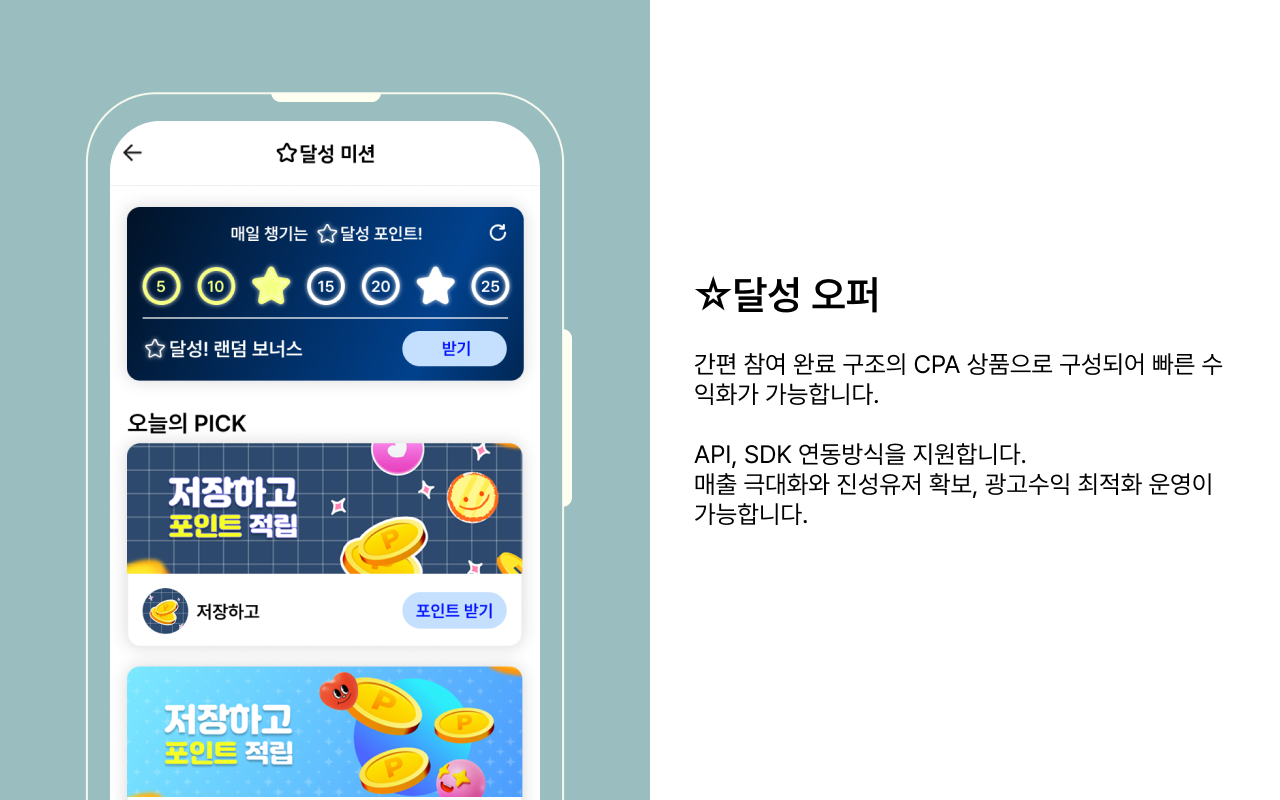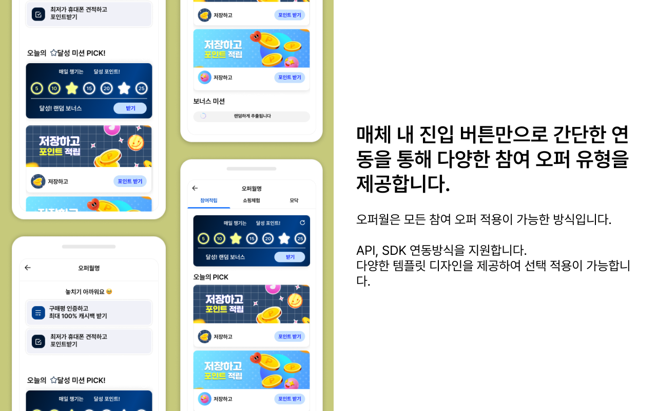 모케이션 오퍼월 통합형은 매체 내 진입 버튼만으로 간단한 연동을 통해 다양한 참여 오퍼 유형을 제공하며, 개발 리소스를 최소화하면서 빠른 수익화를 지원합니다.