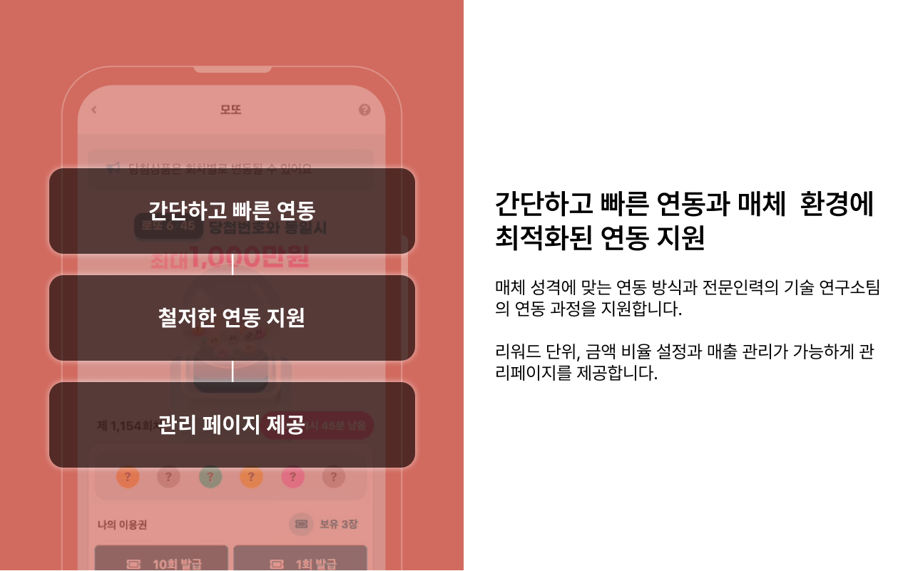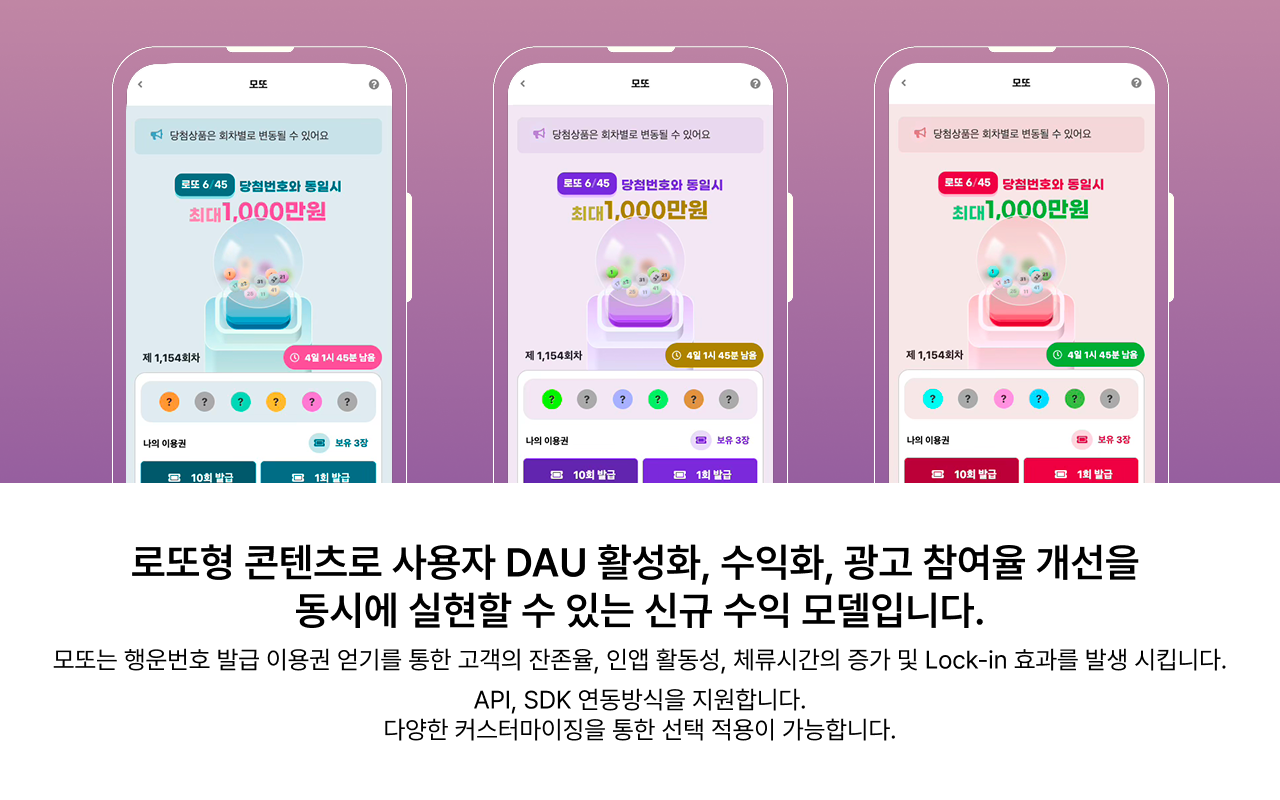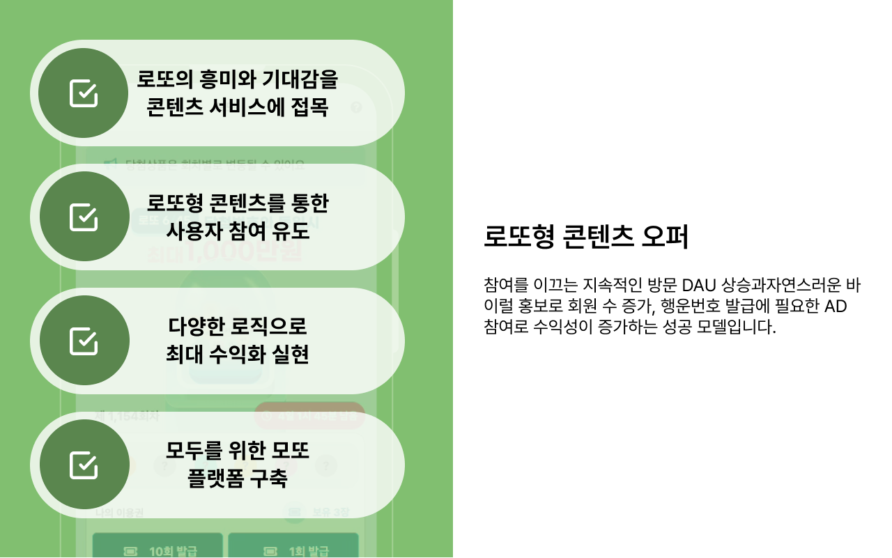 로또의 흥미와 기대감을 콘텐츠 서비스에 접목하였으며, 로또형 콘텐츠를 통한 사용자 참여 유도와 다양한 로직으로 최대 수익화를 실현시킬 수 있습니다.