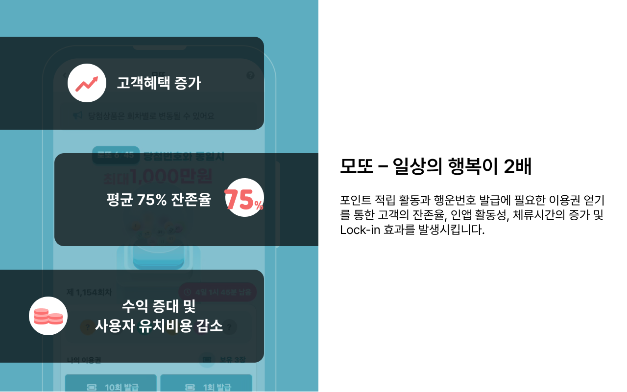 포인트 적립과 행운번호 발급이용권 얻기를 통한 고객 잔존율, 인앱 활동성, 체류시간의 증가 및 Lock-in효과를 발생시킵니다.
